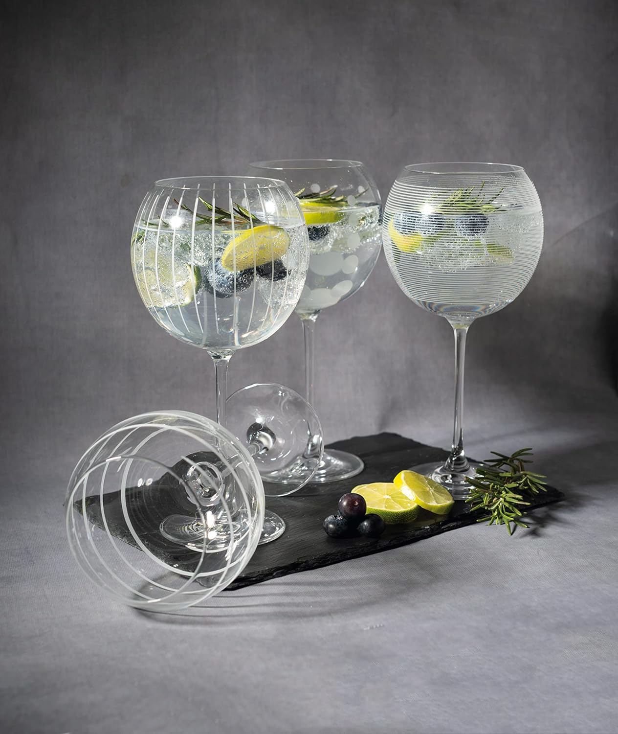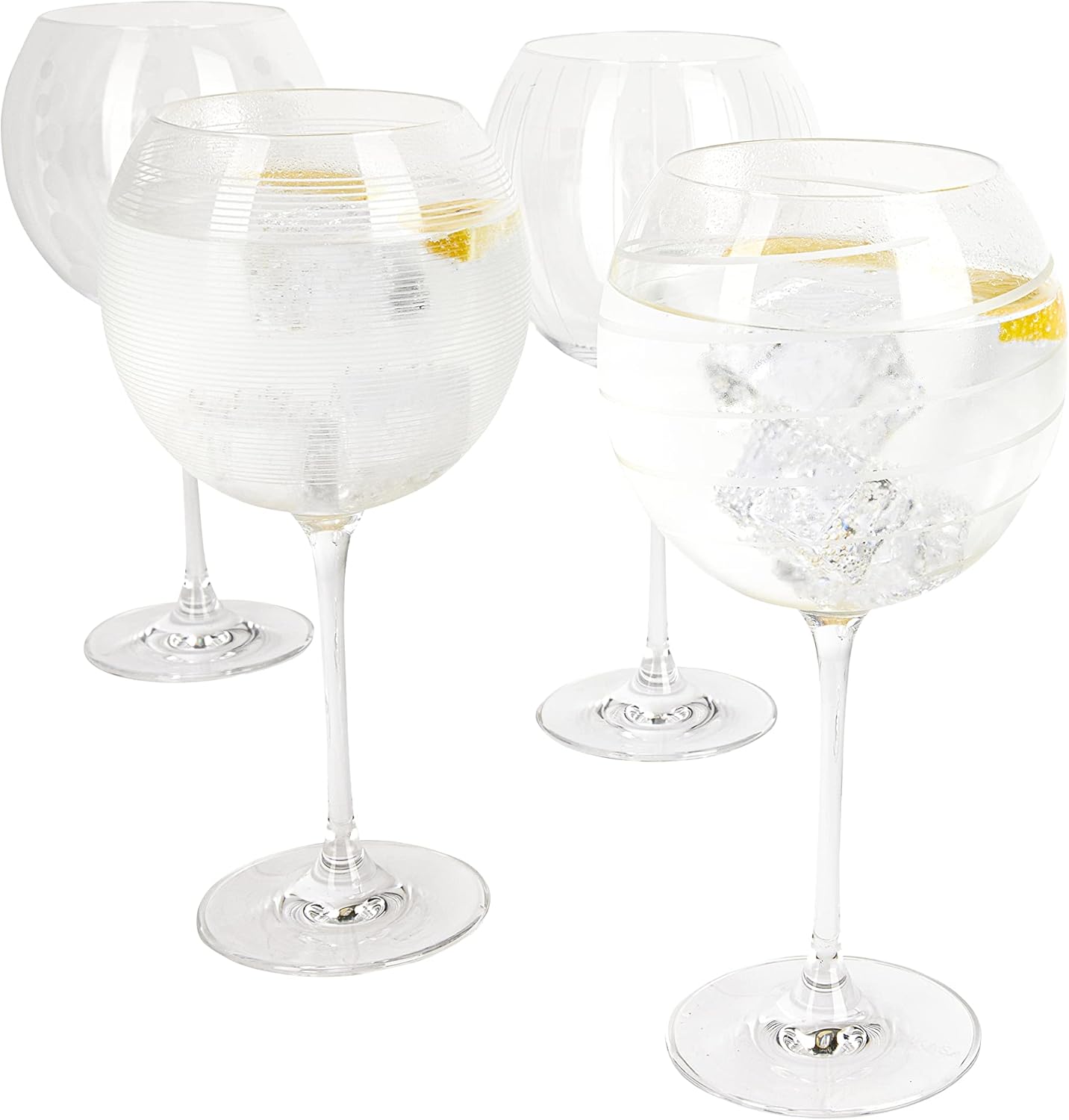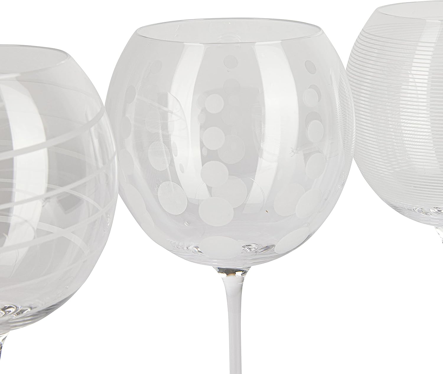 Product Description The fun and quirky designs of the Cheers collection set a festive mood at any gathering. Each glass in the set of 4 is precision-etched with a different yet coordinating design. The dots, lines, and swirls are also distinctive, so each of your guests can easily identify their glass without the need for wine charms. Hand wash recommended. Set Contains: 4 x Glasses